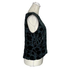 Banana Republic Velvet Burnout Button Back Silk Blend Top. Features stunning velvet burnout that is a floral and foliage design. Color is a black velvet with hints of deep green. Neckline has a pretty burgundy silk trim. Back is accented with a functional button brown. Buttons are covered in burgundy tone silk. Exterior : 73% rayon 27% silk; Lining 100% acetate. Dry clean. Measurements in photos.