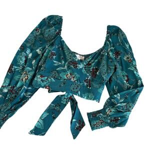 Band of the Free Sybille Teal Floral V-Neck Crop Top Long Sleeve Blouse Size XS