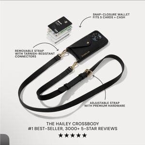 Elegant black leather phone case with adjustable strap. Includes card slot for convenience.