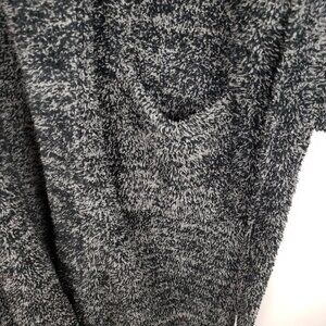 Classic shawl collar mid-length robe. Belt tie at waist. Patch pockets. Unisex. Signature Cozychic knit in two tone gray/black.