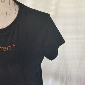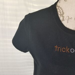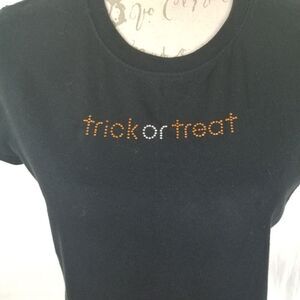 Cute black short sleeve "trick or treat" cotton t-shirt! Perfect for the office or for a fun casual outing!