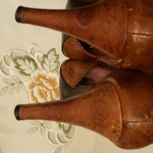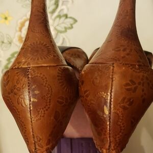 Beautiful leather heels by BCBGirls. Good condition, small inperfections on the inside but outside they look great. approximately 3.5 inches high very confertable. open toe and sides.  distress brown leather.
