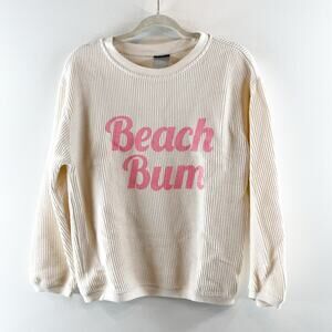 Beach Bum Corded Long Sleeve Crewneck Pullover Sweatshirt Cream Pink Small