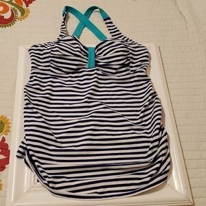 Beach Bump by Motherhood Maternity navy & white striped 2 piece tankini with turquoise accents. Perfect resortware, poolside or at the beach. Excellent pre loved condition, smoke free home, ships next day. All eBay terms apply. All sales final. Thank you for checking out my items!
