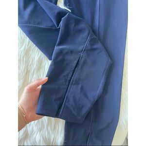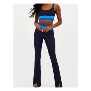 Bring some bold energy to your activewear with these ribbed Beach Riot Sport leggings. Designed in a deep navy with a striking cobalt and aqua blue colorblock waistband, these leggings blend performance with style. The ribbed fabric offers a comfortable stretch fit, while the high waist and slight flare with ankle slits create a flattering, on-trend silhouette.