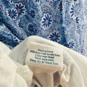 This stunning piece features a delicate blue floral pattern that evokes the charm of a coastal garden in bloom. Designed with a flattering silhouette, it’s accented by deep navy blue trim that adds definition and contrast to the soft, feminine print.