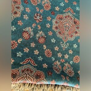 This scarf is very large and beautiful.  One side features the teal background and the backside is a rose pink background.  Interestingly the tassels one end are longer than the other.  I could find no tags with brand and fabric content.  Could be worn as a scarf, shawl, wrap or lap blanket.  Lightweight