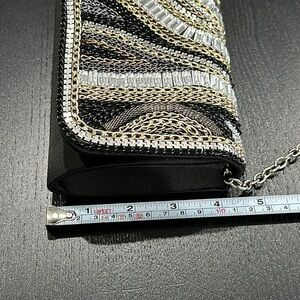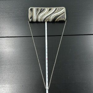 Bebe Chain Design Clutch with Strap. Satin material with a design made of chains and rhinestones. Has a beautiful shine. A beautiful statement piece. It was only used one time. Please refer to photos for exact size, details, and condition.