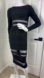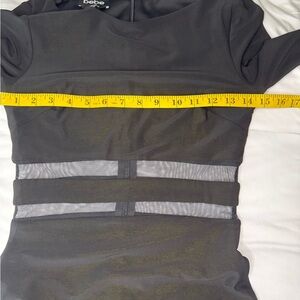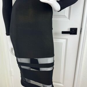 This sleek black bodycon dress by Bebe features a sophisticated mock neck and long sleeves, perfect for a cocktail night out. The dress is designed with subtle gray stripe accents that add a modern touch to its minimalist style, ensuring a flattering fit that hugs the figure.
