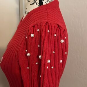 Color(s) may vary due to different lighting and variations on cellphones/monitors. Feminine, red sweater, faux pearl, contemporary, modern, casual, business casual, holidays, photos, Valentine’s Day, Bebe sweater, Christmas, dinner date, girls’ night out, brunch, luncheon