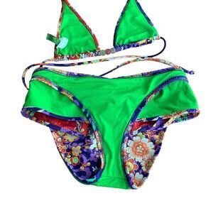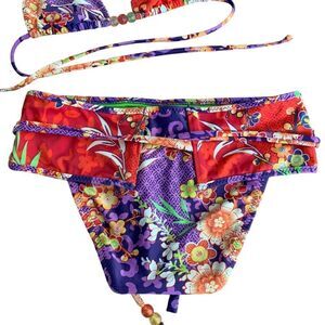 Triangle string halter bikini top with hipster fold over beaded tie waist bikini bottoms. Top is an XS, bottoms are a Small. In GUC, no stains or tears.