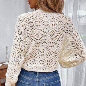 Beige Casual Women's Lantern Sleeve V Neck Knot Side Pointelle Knit Cardigan