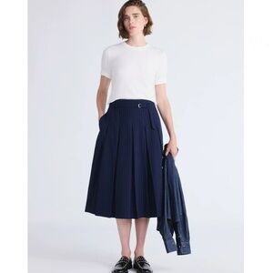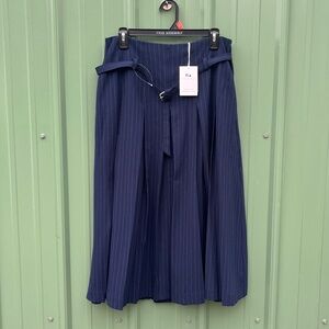 Belted Pleated Pinstripe Midi Skirt, Size 8