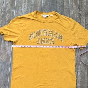 Mustard tee with 'Sherman 1963' print. Ideal for casual outings.