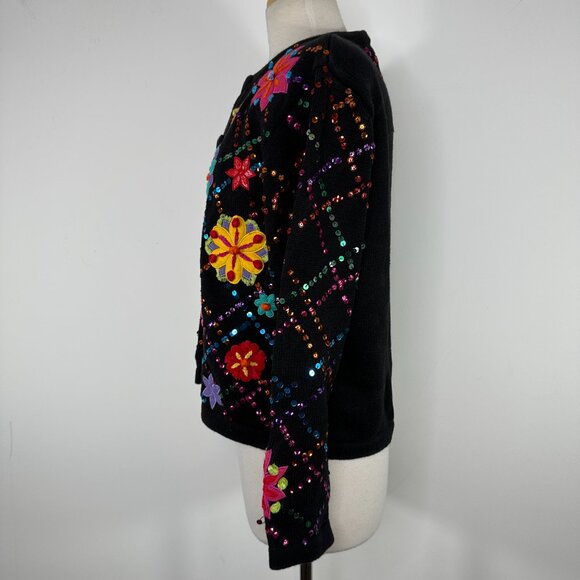 Berek Women’s Floral Button Front Black Cardigan Size L Sequins Embellished Vtg