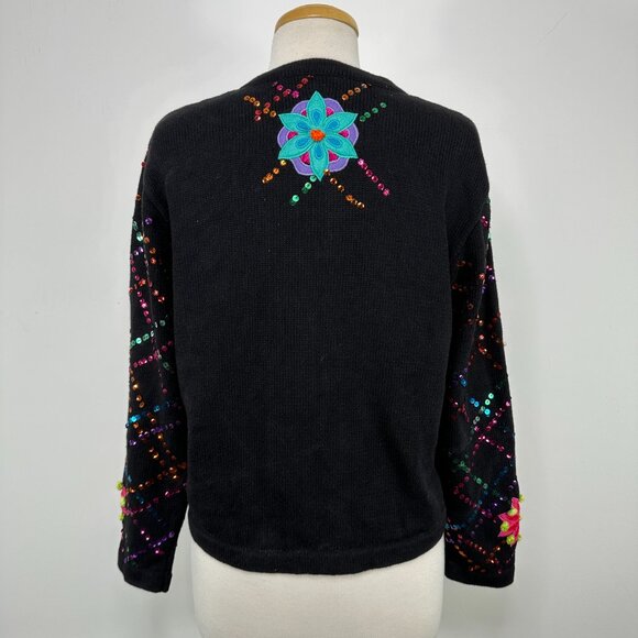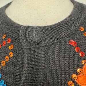 Vintage Berek Women’s Floral Button Front Black Cardigan Size L Sequins Embellished