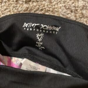 floral abstract print performance leggings from Betsey Johnson. Pink cursive logo on legs.