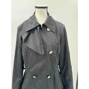 Betsey Johnson Women's Black Button-Up Trench Coat with Lace Trim Detail Medium