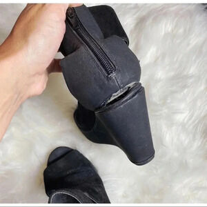 Size 7 black Deena & Ozzie wedge heels with ankle strap. Suede-like material. Purchased from Urban Outfitters. They need a good clean. I don’t know how to clean this material and did not want to ruin them. Also the heel is breaking in the back (see all photos, as damage is described).