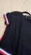 Stylish black dress featuring red and blue stripe accents on the sleeves and sides.