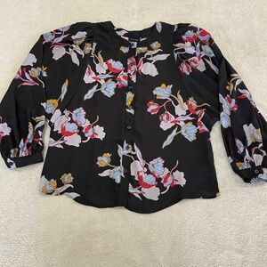 Black, long sleeve sheer top featuring buttons down the front, ruffled shoulder, oversized sleeves with cinched cuffs and beautiful floral print.