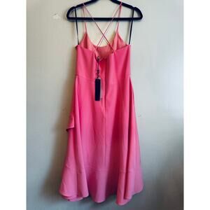 This Black Halo pink party midi dress features a fitted bodice with delicate spaghetti straps, including a crisscross detail at the neckline for a modern touch. The structured waistline flows into an asymmetrical, layered hemline, adding movement and elegance. The vibrant pink hue enhances its playful yet sophisticated appeal, making it a perfect choice for special occasions, cocktail parties, or summer weddings.
