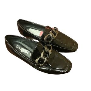 These stylish black mules boast a luxurious suede texture and a charming chain detail on the vamp, providing a chic slip-on style. The rounded toe and flat sole ensure comfort and versatility for any occasion.