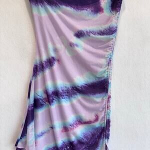 Blanc Clothing sleeveless mini dress with vibrant tie-dye print in purple, blue, and pink. Features a fitted bodycon silhouette, asymmetrical hemline with side ties, and stretchy lightweight fabric. Bold and trendy Y2K-inspired style — perfect for parties, festivals, or nights out. Size S.