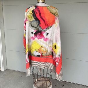 This is an open-front poncho by Blank London, featuring a vibrant abstract print in bold colors like red, yellow, green, and pink. The poncho has a soft, lightweight feel, made from a blend of 61% rayon and 39% wool. It is bordered with a contrasting herringbone pattern along the edges and finished with a fringe trim. The poncho is one size and was made in India.