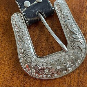 This great Blazin Roxx belt by M&F Western Products ® is authentic Mossy Oak Breakup camo fabric lined with genuine leather. The camo is accented with clear acrylic rhinestones along the edges of the scallop pattern. Each scallop features a large round concho accented with clear rhinestones. This belt is stunning with all of the bling. Removable silver buckle.
