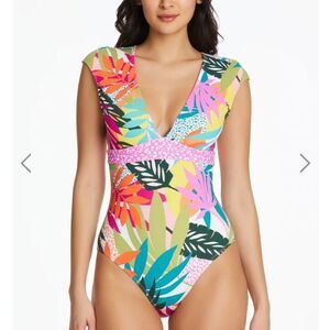 Bleu Rod Beattie Wild At Heart Cap Sleeve Plunge Neck Colorful Tropical Swimsuit