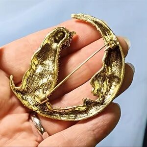 Charming brooch featuring a cat sitting on a crescent moon. Adorned with sparkling blue stones. Gold-tone accents add elegance.