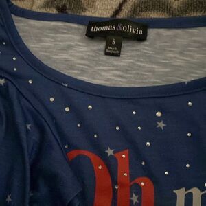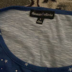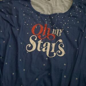 2 Stylish blue tops with 'Oh My Stars' print. Features a tie-front design and star embellishments, one small one large,