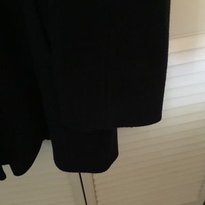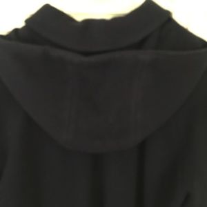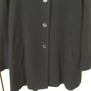 This is a navy blue wool coat. It is a fully lined button down coat with a detachable hood. The measurements are: