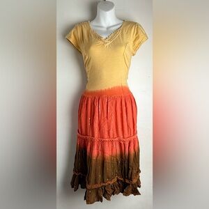 Embrace a bohemian vibe with this stunning gradient skirt. Featuring a beautiful blend of orange and brown, this skirt is perfect for any casual outing. Pair it with your favorite top for a chic look.