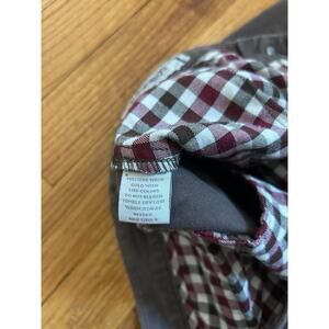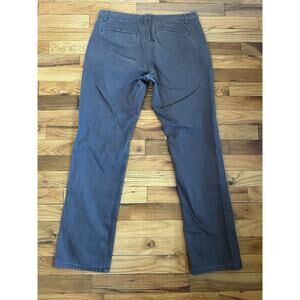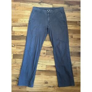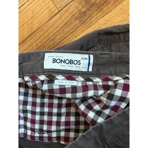 These Bonobos Washed Chino pants are in a classic fit, made of 100% cotton in a dark brown color. They feature a flat front, straight leg style, with a zip and slide snap closure. Ideal for travel or casual occasions, they have slash pockets and a 29-inch inseam. The pants are part of the Bonobos Washed Chino product line, suitable for the winter, fall, and spring seasons. Light wear as indicated in pictures.