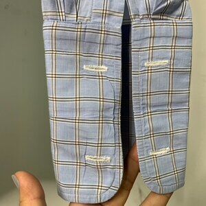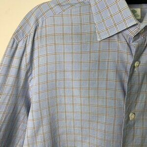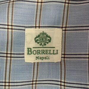 Pre-owned authentic Borrelli Napoli Men's Blue Plaid Long Sleeve Button Down Shirt Size 15 1/2. Has some marks. 100% Cotton. Aprox measurements: Armpit to armpit is 22.5" inches. Length is 30.5" inches. Sleeve is 28" inches. Please look at pictures for better reference. Happy Shopping! OCT22. T5
