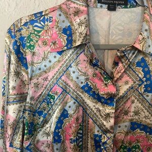 Elevate your wardrobe with this vibrant floral patterned top. Featuring a mix of pink, blue, and green hues, this piece is perfect for any occasion. Enjoy the comfort and style it brings to your outfit.