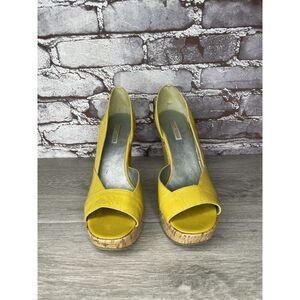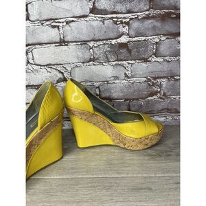 Selling Bottero Yellow Patent Leather Peep Toe Platform Cork Wedge Sandals Women’s Sz 37EU/6.5M US