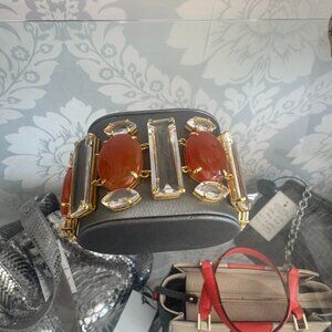 Clear and Coral colored gemstones placed in a gold setting with an easy closure.