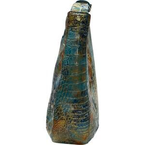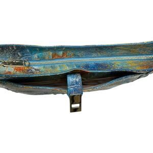 Featured in Reef Melbourne, an abstract deep sea print blending bright blue and golden orange tones. Pops of metallic gold add an elevated touch. Genuine croc-embossed leather.