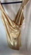 Gold satin dress, formal or semi-formal style. The dress features a draped neckline, thin straps, and ruching detail on one side, cinched waist. shiny, smooth fabric, 109% Polyester New , Poly USA, which specializes in prom and special occasion dresses.