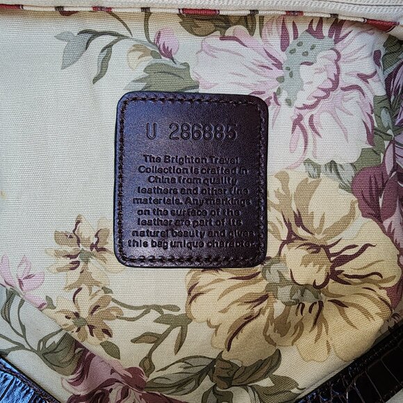 The bag weighs about 8 lbs. and has a sturdy pull-out telescoping handle and robust wheels for easy, gliding, transporting. The telescoping handle extends to 29.0". The bag is made of brown gator leather and black cloth material on the outside and the inside is a lovely floral and striped pattern in a cloth material. The suitcase is tear free with no stains and all zipper pulls are intact and functional.