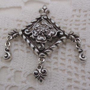 Don't miss out on this pretty silver tone brooch by Brighton! There is a flower inside of a diamond shape, with a fleur de lis on the top and scroll dangles. It measures 2 1/4" x 2" and is in excellent condition.