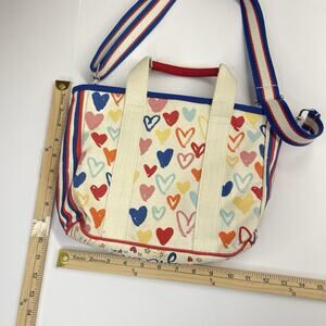 Brighton canvas tote bag w/ colorful heart print and patriotic red white blue striped strap. Front patch reads “LOVE,” inside label says “Sparkle and Shine” with fireworks design