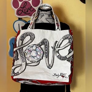 Stylish Brighton tote with vibrant red, gold, and silver accents. Features intricate jewelry designs. Adds elegance to any outfit.