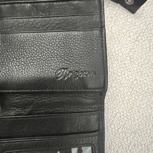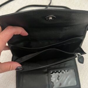 Classic crossbody/wallet/purse...tumbled black leather with croc embossed flap...inside pocket with another w/zip...slots for cards (4) depending on how you like to stack em ;-) lower pocket for cash and a ID window...magnetic flap closure...Top zip pocket ...removable braided crossbody strap so t can be used a clutch...its in excellent condition NO SCRATCHES or Dents