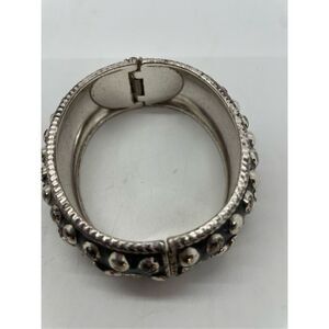 Brighton silver plated "Rockin Hearts" black enamel/crystal Cuff Bracelet. Pre-owned, very good condition. 2.25 in diameter. Hinged with magnetic closure.