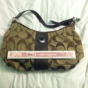 Brown and Tan Authentic Coach Handbag purchased from Coach store in very good condition, only carried a few times, comes with optional shoulder strap accessory, medium size with pockets on interior