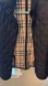 Sleek black quilted design. Features signature Burberry check lining. Perfect for warmth and elegance.